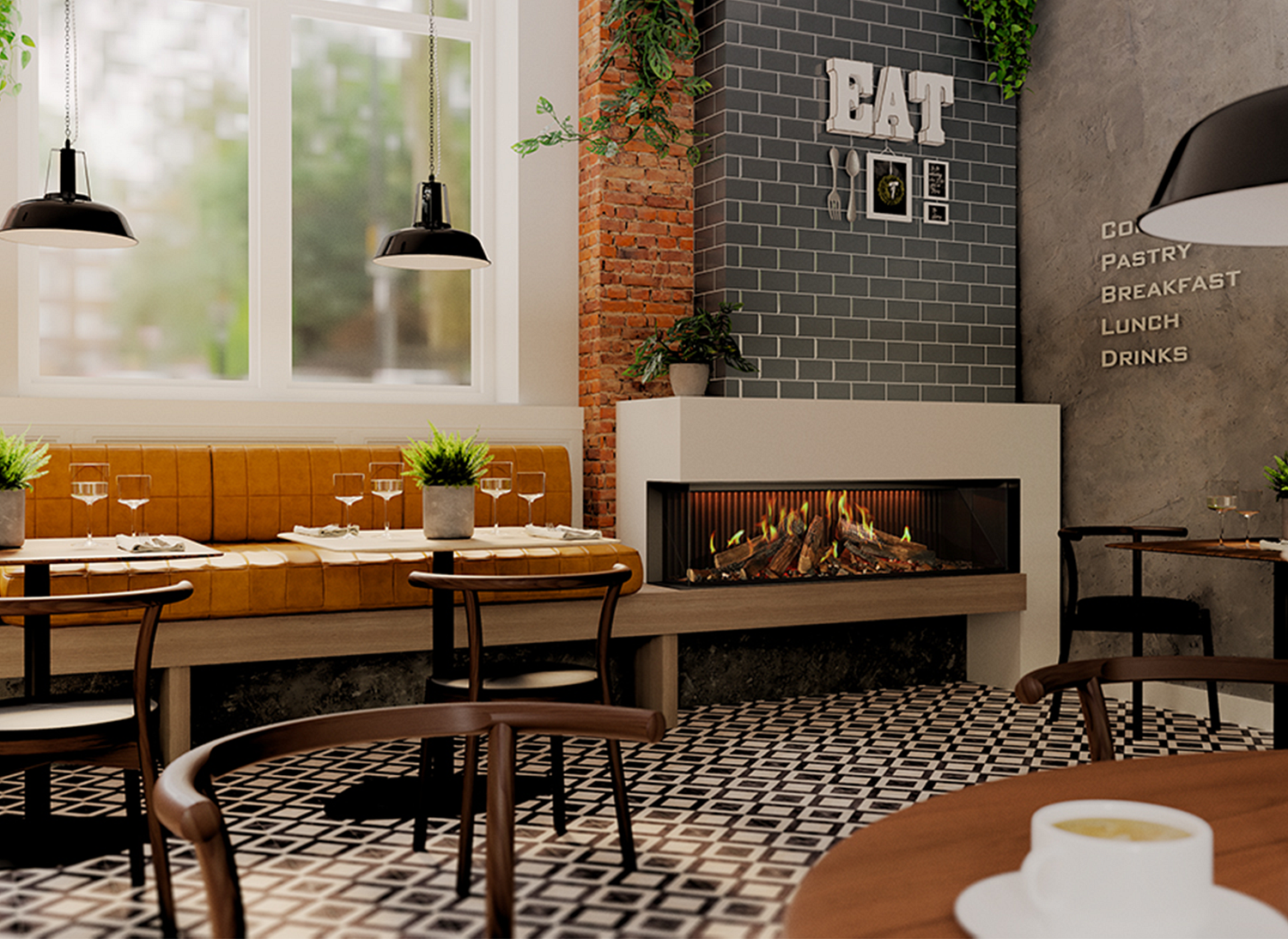 Tweezijdige elektrische haard met breed vuurbeeld